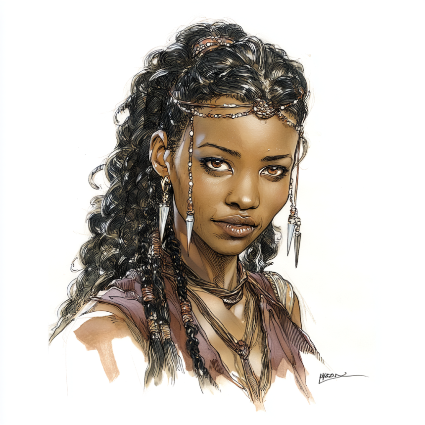 Makena wa Zuberi was born along the coral coast of Azania, where the Indian Ocean’s tides carried dhows from Arabia, India, and the islands beyond. Her family were merchants and healers, steeped in the dual arts of trade and medicine, for in Azania commerce was never divorced from care. Her name, Makena, meaning “the one who brings happiness,” seemed prophetic, for even as a child she had a gift for lifting spirits. She grew up amid the mingling of tongues and cultures, learning to speak not only her own Swahili but also fragments of Arabic, Sanskrit, and Persian from sailors who passed through the bustling harbors.