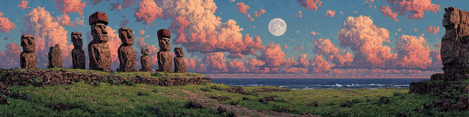 On Rapa Nui, the Moai stand facing inland, guardians of community rather than sea. Each colossal figure bears the likeness of an ancestor, eyes once inlaid with coral that caught the morning light. Carved and moved without metal tools or beasts, they embody pure coordination - faith as engineering.