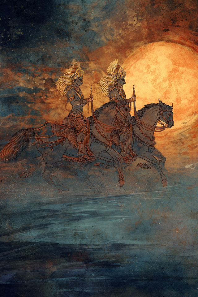In the hymns of the dawn, the Ashvins ride. Twin horsemen, radiant and youthful, they drive their golden chariot across the early sky, heralding the sun’s approach. They are healers and rescuers, gods of swiftness and compassion, answering prayers of mortals when all hope seems lost. Where their horses gallop, light follows, and the chill of night is broken.
