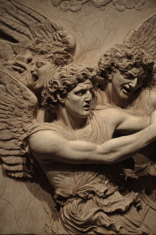 No sooner had he done the deed than the air grew heavy and the earth seemed to darken. From the shadows emerged the Furies — the ancient daughters of Night, older than Zeus, older even than the Olympians. Their hair was knotted with snakes, their eyes dripped with blood, their voices shrieked like hounds on the scent. They surrounded Orestes, chanting his guilt, and drove him into madness.