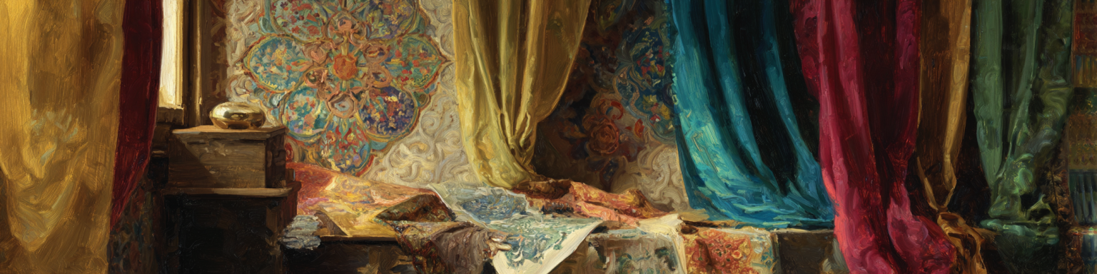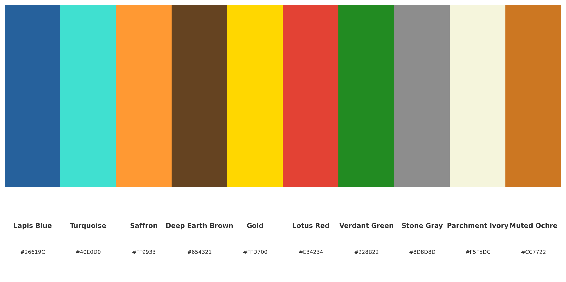 | Here’s a visual sample card of the palette, complete with hex numbers. • Lapis Blue (#26619C) • Turquoise (#40E0D0) • Saffron (#FF9933) • Deep Earth Brown (#654321) • Gold (#FFD700) • Lotus Red (#E34234) • Verdant Green (#228B22) • Stone Gray (#8D8D8D) • Parchment Ivory (#F5F5DC) • Muted Ochre (#CC7722) This card balances the Persian blues/golds, Indic saffron/lotus tones, Buddhist neutrals, and the grounding earth shades. | Here’s the Dark Mode palette card — deeper, richer tones that complement the lighter scheme: • Midnight Blue (#13294B) • Deep Teal (#006666) • Burnt Saffron (#CC6600) • Charred Umber (#3D2B1F) • Antique Gold (#B8860B) • Crimson Lotus (#8B1A1A) • Forest Green (#0B6623) • Iron Gray (#4B4B4B) • Aged Parchment (#D9D6C3) • Dark Ochre (#8B4513) This set is great for night scenes, interiors, ceremonial tones, or dramatic art direction — while still being rooted in Persian/Indic/Buddhist palettes |