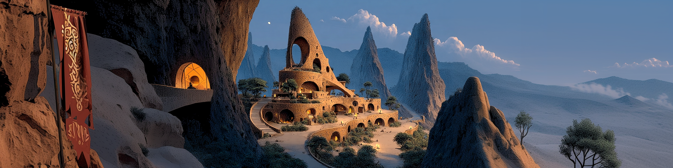 Responding to this change, the Earth-Mother reached toward the Mortal Realm and shaped a vast meeting structure at the heart of Aotearoa: an immense earthen formation grown rather than built, with rising spires, interior hollows, and chambers shaped by natural geometry. The place feels organic, timeless, and purposeful—neither temple nor fortress, but a gathering point formed from the land’s own memory. It becomes the anchor point between the Dreaming and the waking world.