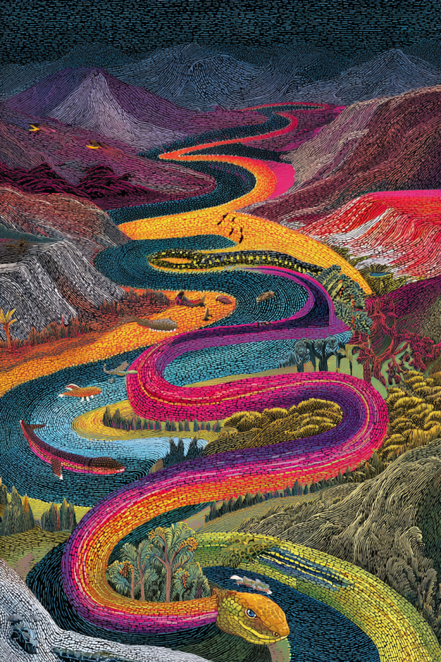 As the Serpent moved, the world awoke. Its body carved deep valleys and channels, which filled with flowing rivers. Where it coiled, mountains rose; where it passed, billabongs spread wide. The people, the animals, and the plants stirred from the earth, drawn forth by its breath. To each it gave a place and a path, weaving the laws of kinship and survival.