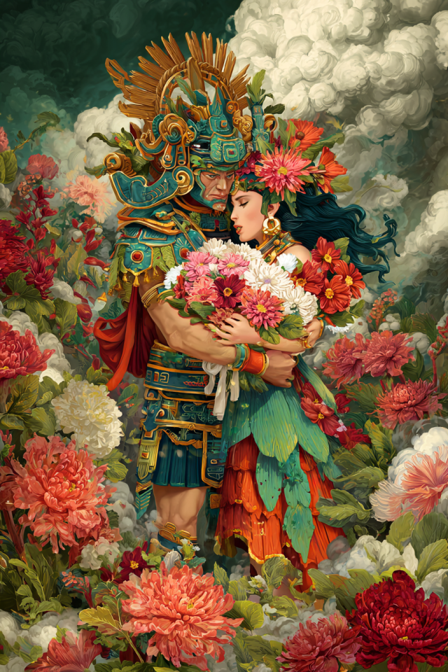 So the tale of Xochiquetzal and Tlaloc endured, bright and sorrowful, a lesson that love and fertility must always be cherished, lest they be carried off into shadow.