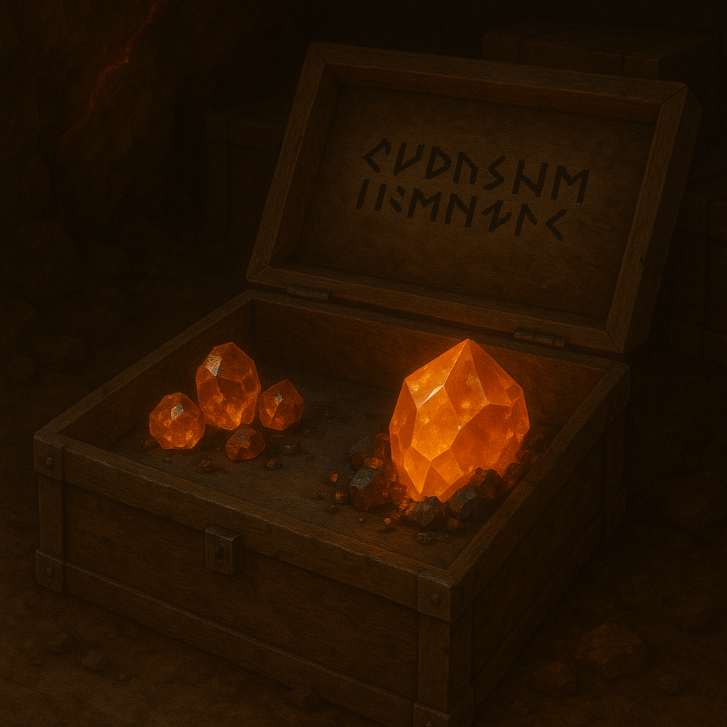 Char-black ore veined with molten amber that glows from within, pulsing like trapped embers. Despite the amber-like parts of the ore appearing more mineral than ore, the two parts of the ore structure are chemically identical. Has a magical conductivity rating of 6 out of 10.