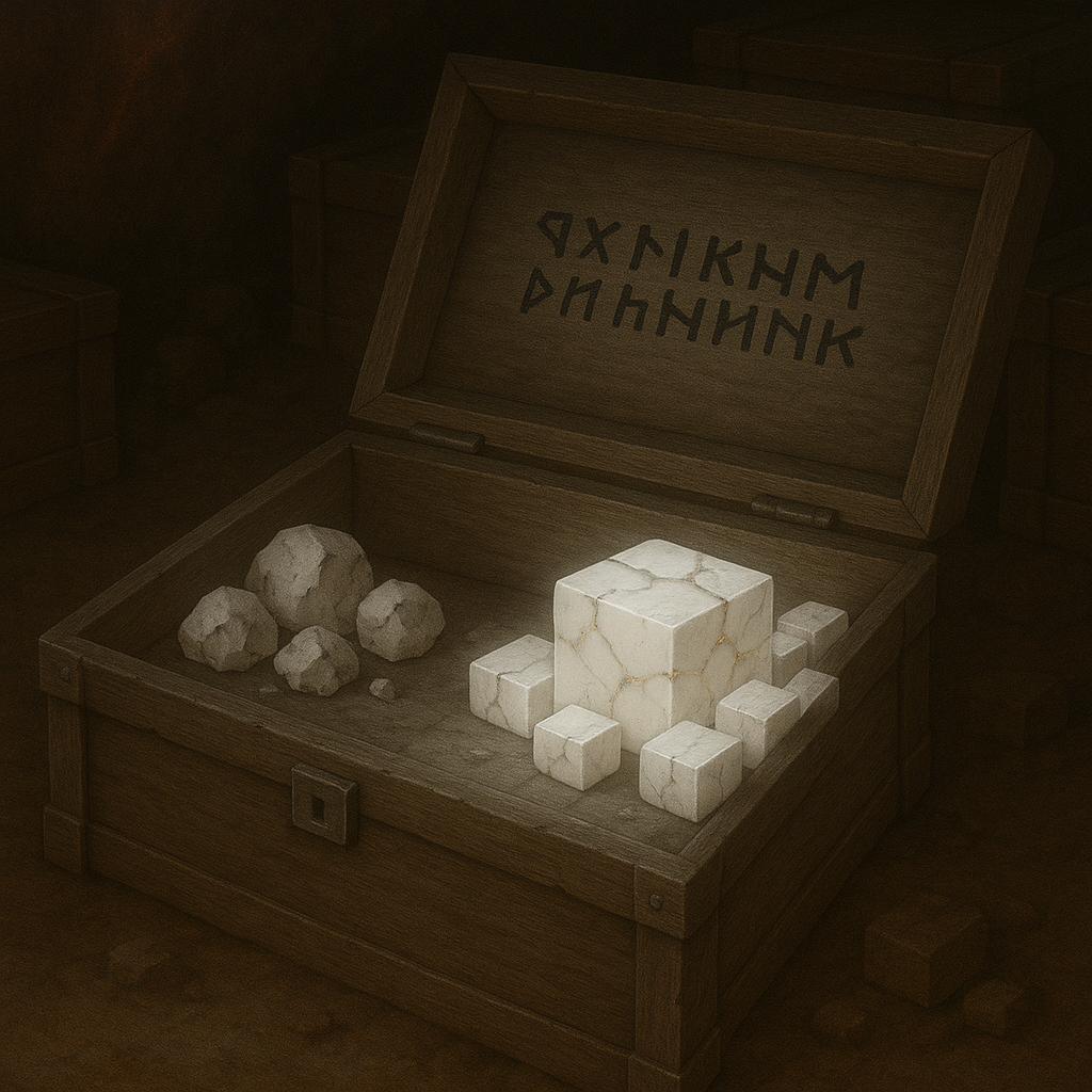Raw Sundorite is pure white with thin black marbling running throughout and is frequently mistaken as marble. Once processed, the material takes on a white and gold marble that naturally shapes into cubes that glow in daylight. All Sundorite radiate a gentle warmth, illuminating surroundings even without flame and cannot be darkened or diminished except by magical means. Has a magical conductivity rating of 8 out of 10.