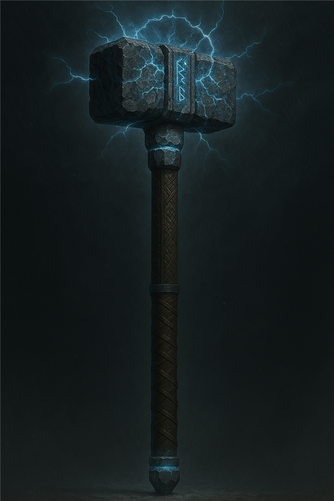 The Head: The weapon's massive striking head appears to be carved from a single block of storm-touched granite, its surface shot through with veins of silver-blue ice that never melts. Within the stone, crystalline formations catch and reflect light like captured lightning, creating an internal glow that pulses with each thunderclap in the distance. Runic inscriptions in the ancient Giant tongue spiral around the head, their letters filled with perpetually flowing ice-melt that somehow never drips away.
