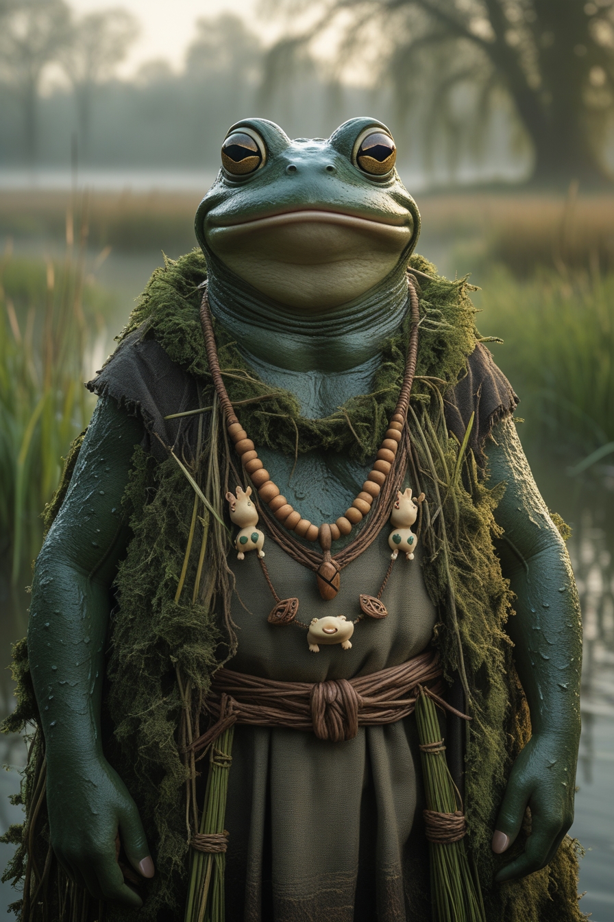 An elderly humanoid frog with a broad, sturdy build and a weathered but warm demeanor. His skin is a deep, mossy green mottled with dark brown patches, resembling the texture of wet stone and pond algae. His eyes are large and round, the color of polished jade, with a calm, steady gaze that speaks of decades of wisdom.