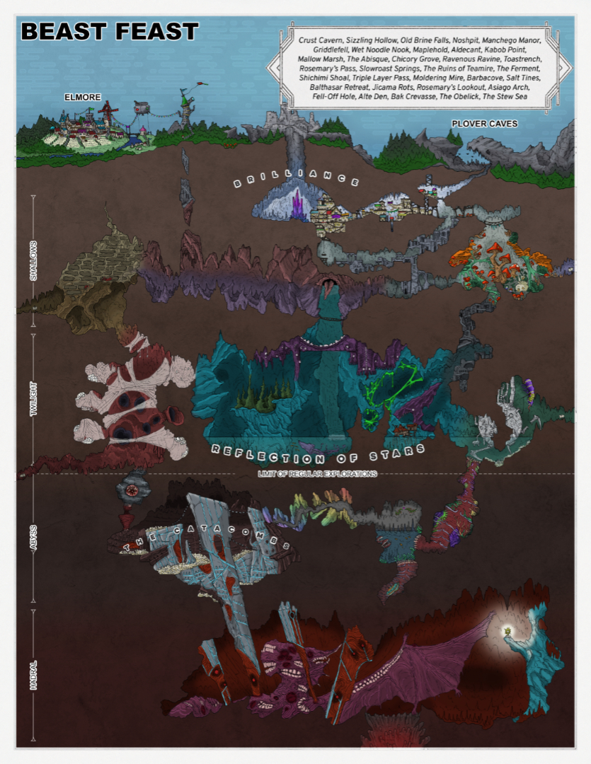 Wildly varied depending on specifically which part of the cave system you're in. There are fungal forests, giant underground caves (more than one), catacombs, mountain ranges, and more.