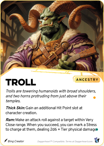 Trolls can be seen at all levels of society, but due to their large size, many of them are drawn to serve in the military or law enforcement. Others leverage their girth in agriculture, forest service, and construction. Having said that, trolls are not limited to what they can do in the Empire . Maybe they have a knack for the lute and a deep crooning voice that makes couples fall in love over and over again; or maybe they find themselves working their way up through the shadowy underworld as rogues. It's up to each troll and the circumstances of their life what path they follow.