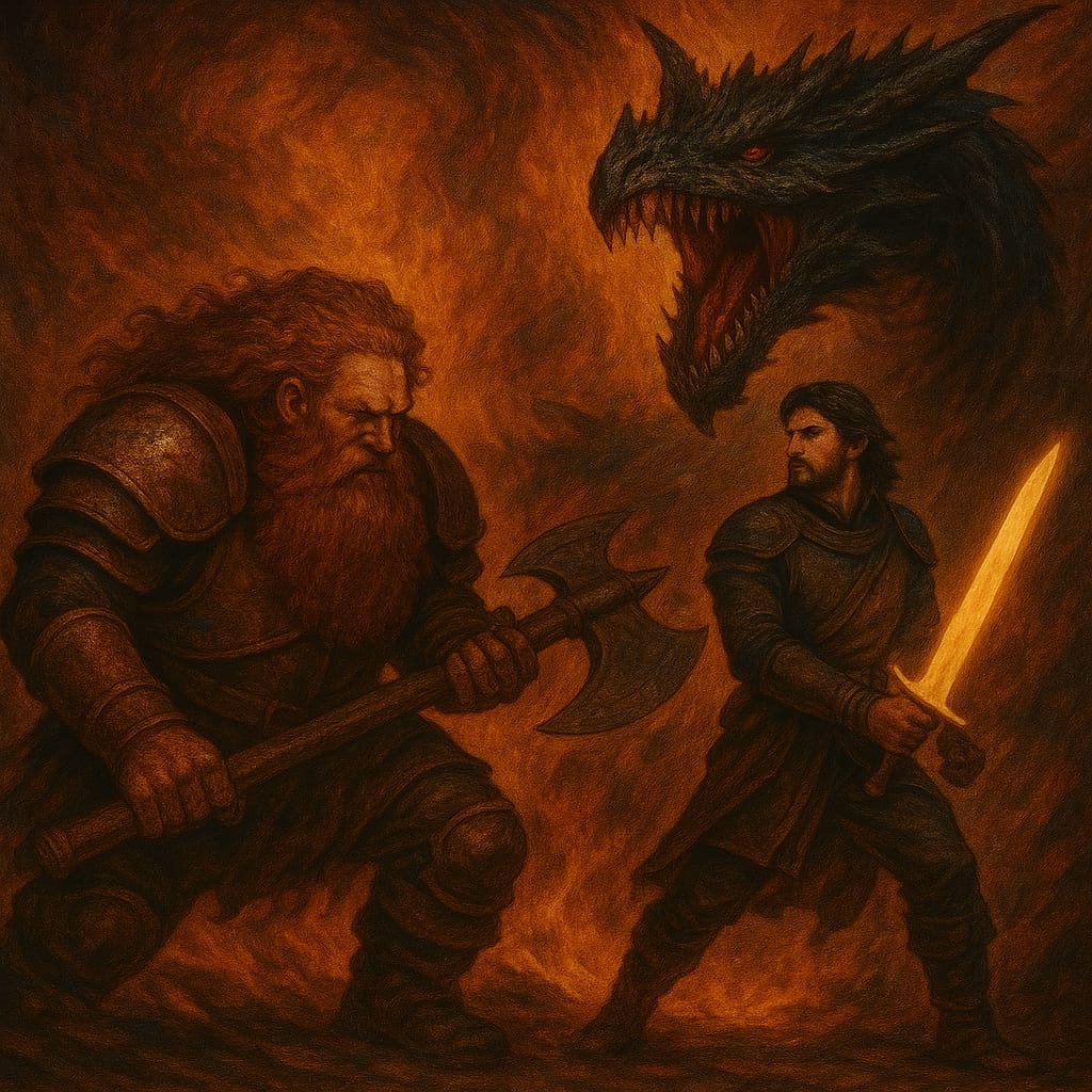 In alto Drugo e Manfred in lotta contro un cucciolo di drago di fuoco durante L'ordalia di Miranda