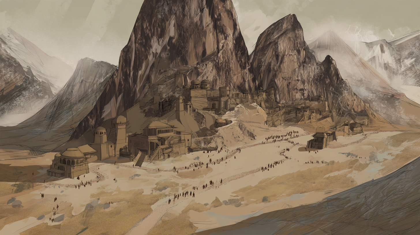 Le plus haut d'entre eux était le Temple des Mystères, que très peu de voyageurs pouvaient atteindre ; les pentes supérieures du Lungma Jiin étaient une échelle de granit effrité et de glace fine, constamment balayée par des coups de vent glacials. Selon la légende, les reliques les plus sacrées des Somtaaw étaient conservées sur l'autel de ce temple, et tout pèlerin qui faisait le voyage à pied était autorisé à les toucher : les Rouleaux de Métal Stellaire , qui auraient été écrits par la main de Jakuul lui-même, dans une langue qu'aucun homme vivant ne pouvait lire.