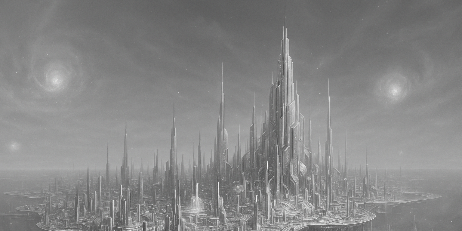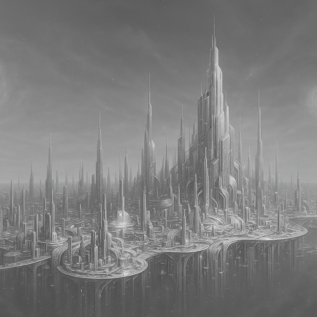 Les cités de Chokmah ne ressemblent pas aux agglomérations classiques des autres séphiroth. Ce sont des œcuménopoles argentées, des mégastructures continues qui recouvrent les perles de lumière servant de foyers civilisationnels. Leur silhouette s’étend comme des continents d’acier poli et de cristal liquide, se reflétant à l’infini dans le vide gris perle qui entoure le royaume.
