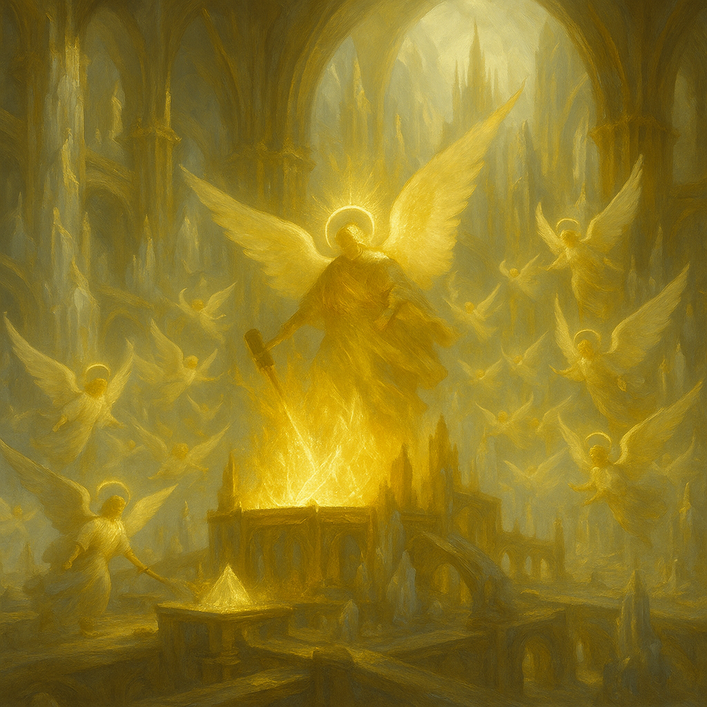 Les édifices religieux dominent l’espace urbain : immenses basilicas de cristal blanc et d’or, dont les voûtes résonnent des hymnes séculaires des chantres. Les forges séraphiques, quant à elles, prennent la forme de vastes halls aux colonnes dorées, où le feu sacré sculpte le cristal pour donner naissance à des armes, des artefacts ou des azohim de prestige. Même les ateliers et les manufactures dégagent une aura solennelle, chaque outil et chaque mur étant gravés de runes lumineuses.