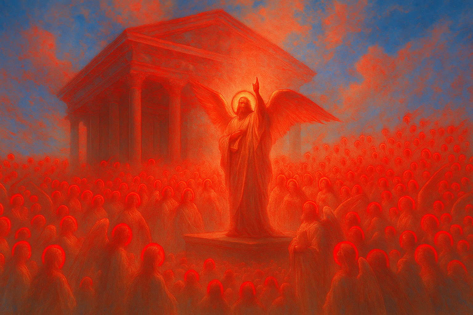 La procession guerrière atteignit finalement le Sanctuaire Olympus, siège temporaire de l’Ordre des Astres. Là, les dominations n’hésitèrent pas à user de leurs pouvoirs mentaux pour forcer le passage, dominant l’esprit des gardes, et dans les cas de résistance, brandissant leurs armes contre leurs propres frères élohim.
