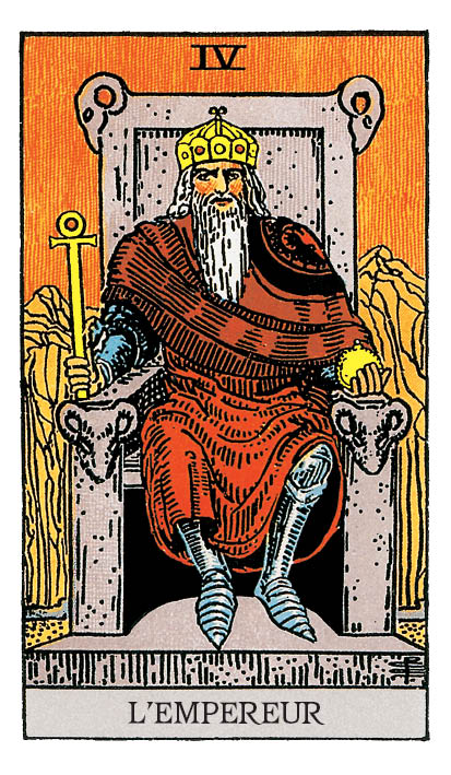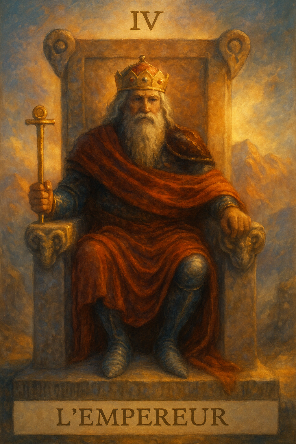 La carte de L’Empereur (arcane IV du Tarot) incarne la stabilité, l’ordre et l’autorité. Assis sur son trône, sceptre et globe en main, il représente le pouvoir établi, la loi qui structure et protège. Là où l’Impératrice féconde et fait croître, l’Empereur organise, délimite et donne forme durable. Il est l’architecte du monde matériel, garant de la stabilité et de la pérennité. Dans son aspect lumineux, il est protecteur, bâtisseur et sage. Dans son aspect sombre, il peut devenir tyrannique, rigide ou oppressif.