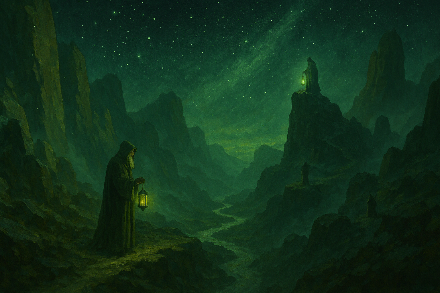 Au sommet des pitons rocheux apparaissent des figures solitaires portant des lanternes cristallines. Ces lanternes diffusent une lueur dorée qui guide les âmes, mais n’éclaire que quelques pas devant elles.