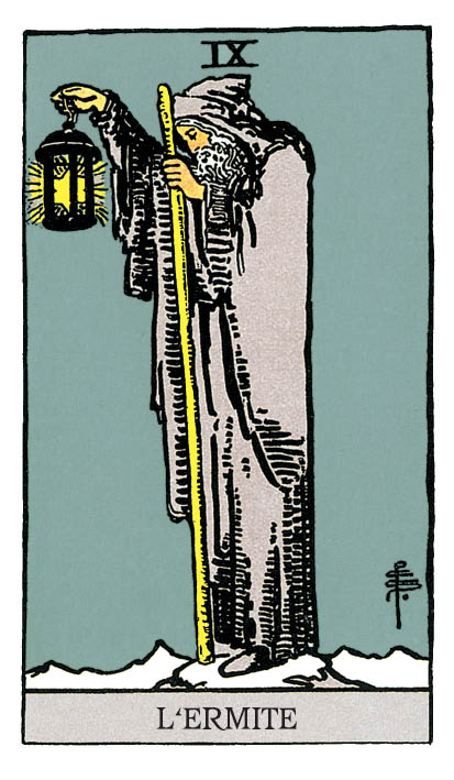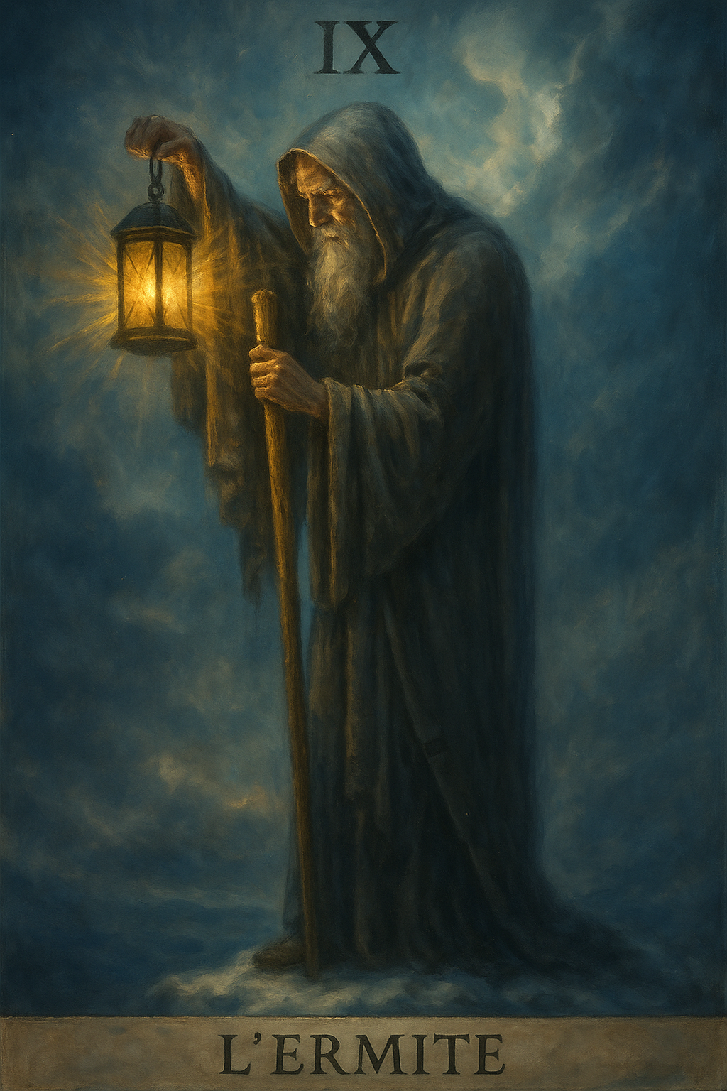 La carte de L’Hermite (arcane IX du Tarot) représente la sagesse intérieure, la prudence et la recherche spirituelle. Vieillard tenant une lanterne qui éclaire son chemin, il avance seul et lentement, symbole de l’âme en quête de vérité profonde. L’Hermite incarne la connaissance patiemment acquise, le silence fertile, la lumière intérieure qui guide dans l’obscurité. Il n’agit pas dans le monde extérieur comme le Chariot ou l’Empereur, mais se retire pour discerner et comprendre. Dans son aspect lumineux, il est maître, guide et sage. Dans son aspect sombre, il peut verser dans l’isolement stérile ou l’inertie.