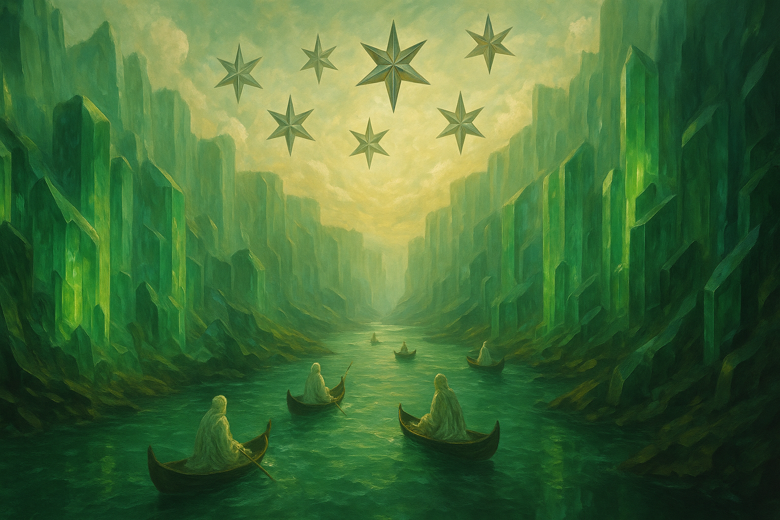 La Route de l’Étoile traverse un canyon de cristal vert, où coule une rivière émeraude reflétant la lumière des astres.
