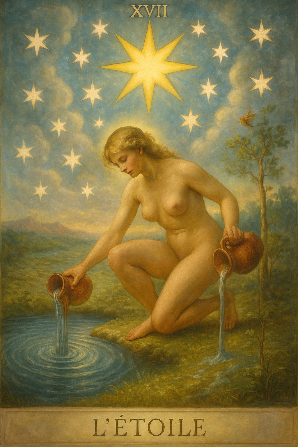 La carte de L’Étoile (arcane XVII du Tarot) est l’image de l’espérance, de la grâce et de l’harmonie retrouvée après la crise de la Tour. On y voit souvent une femme versant de l’eau, sous un ciel étoilé, symbole de régénération et de communion avec le cosmos. L’Étoile incarne la pureté de l’âme revenue à son essence, la confiance en la lumière supérieure et la réconciliation avec la nature. Elle est l’arcane de la paix, de la foi et du renouvellement spirituel.