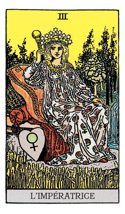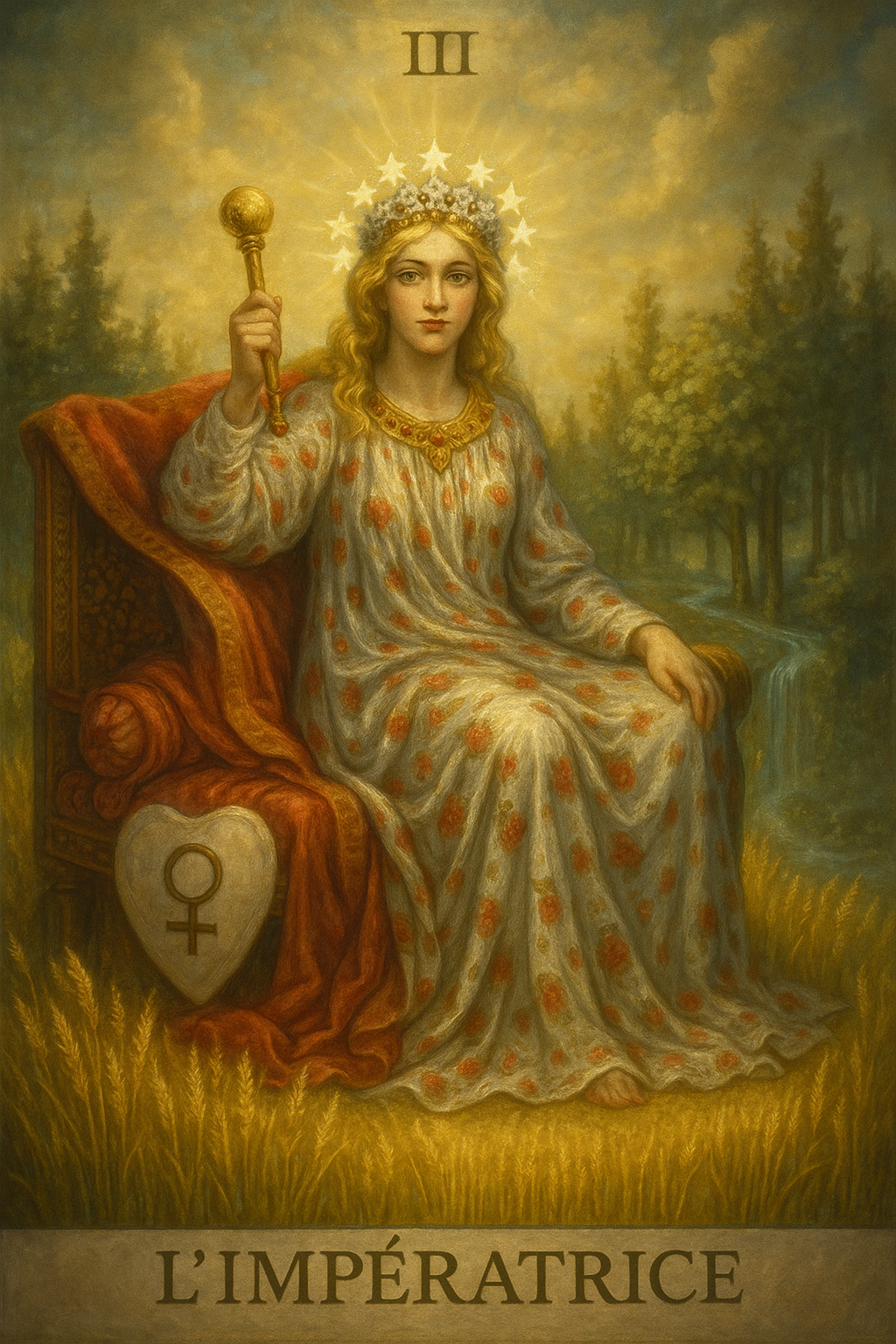 La carte de L’Impératrice (arcane III du Tarot) incarne la fécondité, la créativité et l’intelligence vivante. Assise sur son trône, couronnée d’étoiles, elle représente la mère souveraine, source de toute croissance et de toute abondance. Là où le Magicien met en œuvre la volonté et la Haute Prêtresse conserve la connaissance intérieure, l’Impératrice manifeste dans le monde les fruits de cette union. Elle est la puissance de création qui s’exprime à travers la beauté, la nature, l’amour et l’art. Elle symbolise aussi l’intelligence concrète, capable de donner forme aux idées et de nourrir les êtres.