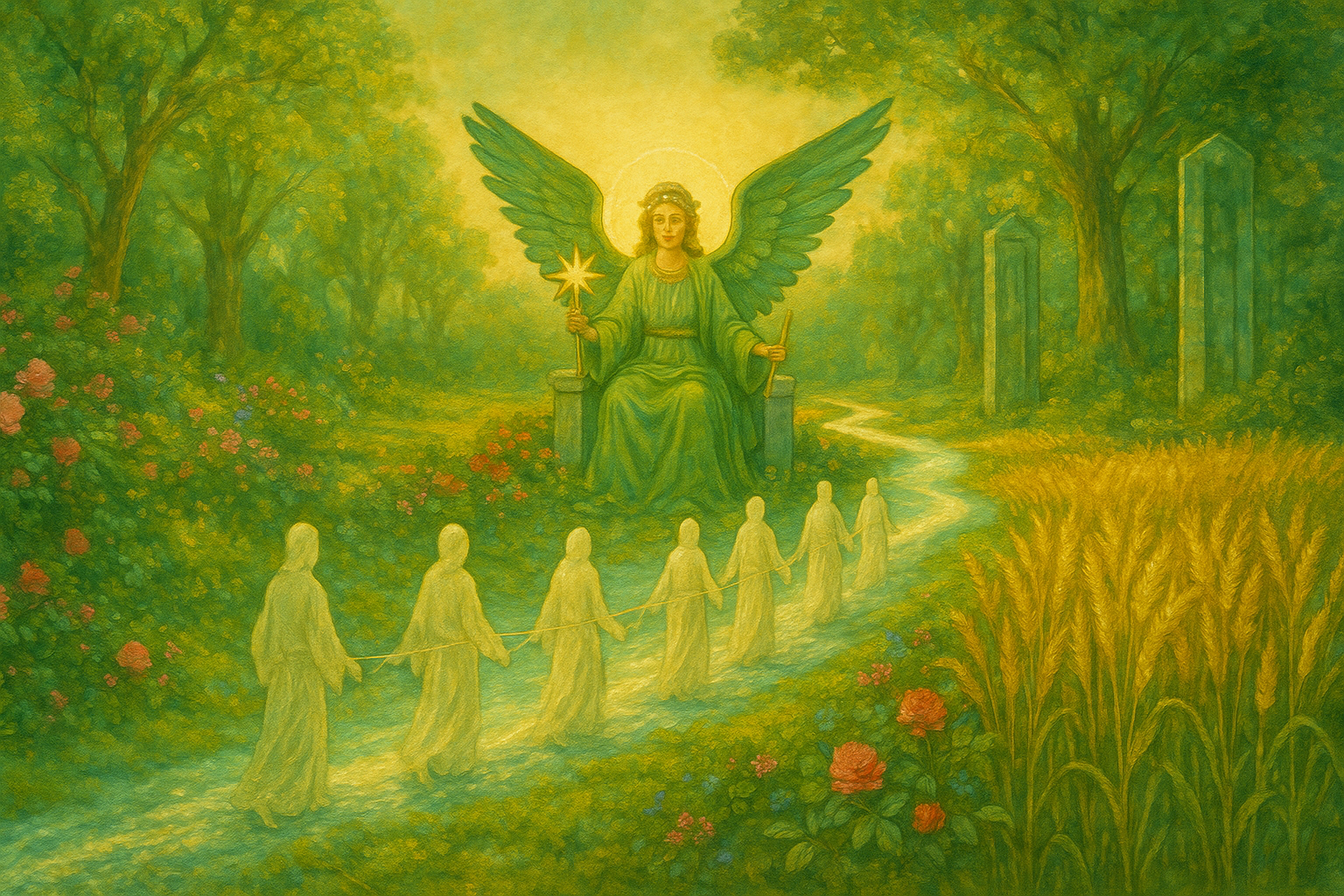 Au loin se dresse un trône de cristal émeraude, occupé par une figure féminine ailée, irradiant à la fois majesté et douceur.