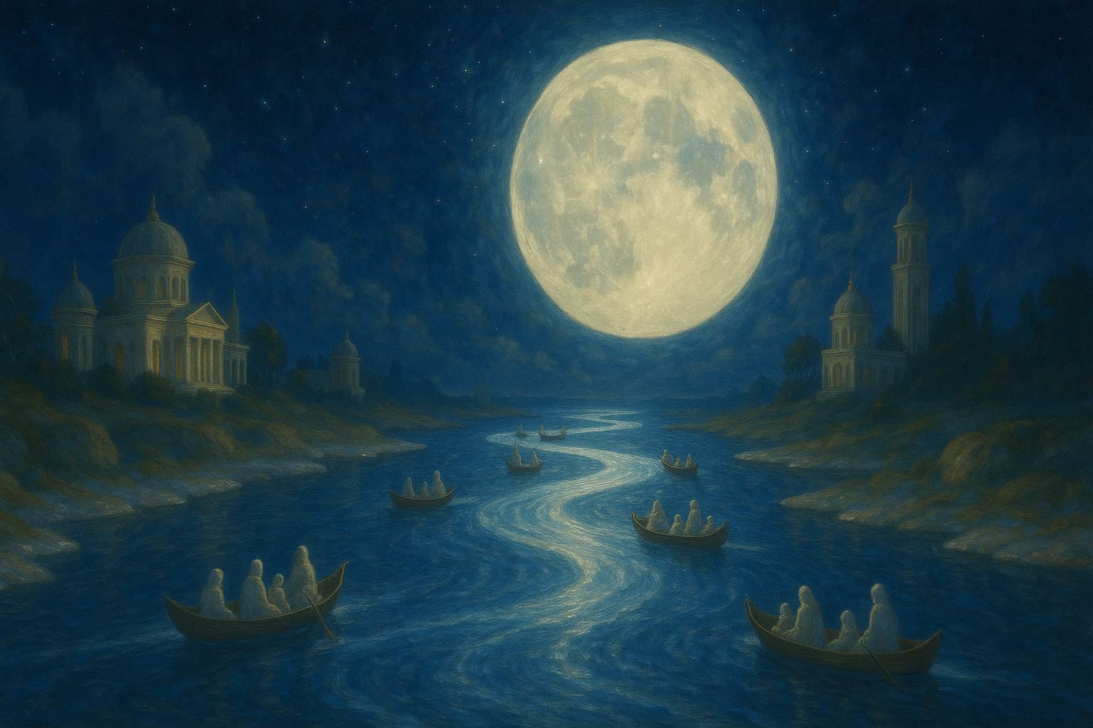 La Route de la Lune serpente dans un paysage nocturne argenté, sous la clarté diffuse d’une lune immense.