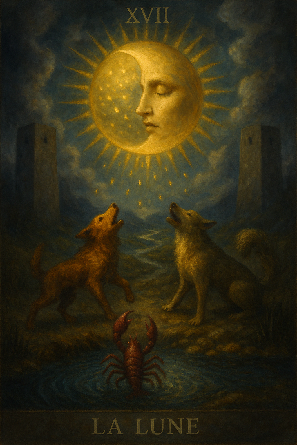 La carte de La Lune (arcane XVIII du Tarot) incarne le mystère, l’inconscient et l’illusion. On y voit généralement deux tours, un chemin entre elles, un chien et un loup hurlant, et une écrevisse qui sort d’un étang. C’est le royaume des rêves, des fantasmes et des projections. La Lune symbolise l’inconscient collectif et individuel, avec ses peurs, ses mirages et ses séductions. Mais elle est aussi la gardienne de l’intuition et des profondeurs intérieures. Elle met l’âme à l’épreuve de ses ombres pour qu’elle apprenne à distinguer le vrai du faux.
