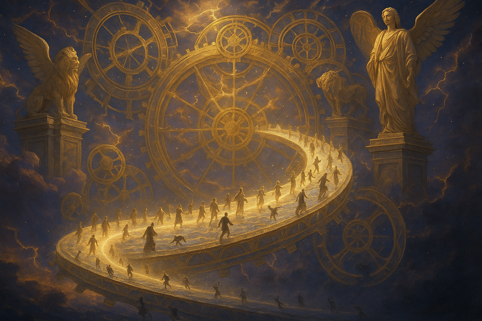 Les âmes qui l’empruntent avancent en spirale : certaines montent vers les hauteurs lumineuses, d’autres basculent soudain dans l’ombre. Chaque pas semble soumis à un hasard insondable, comme si la route testait la capacité des voyageurs à accepter le destin changeant.