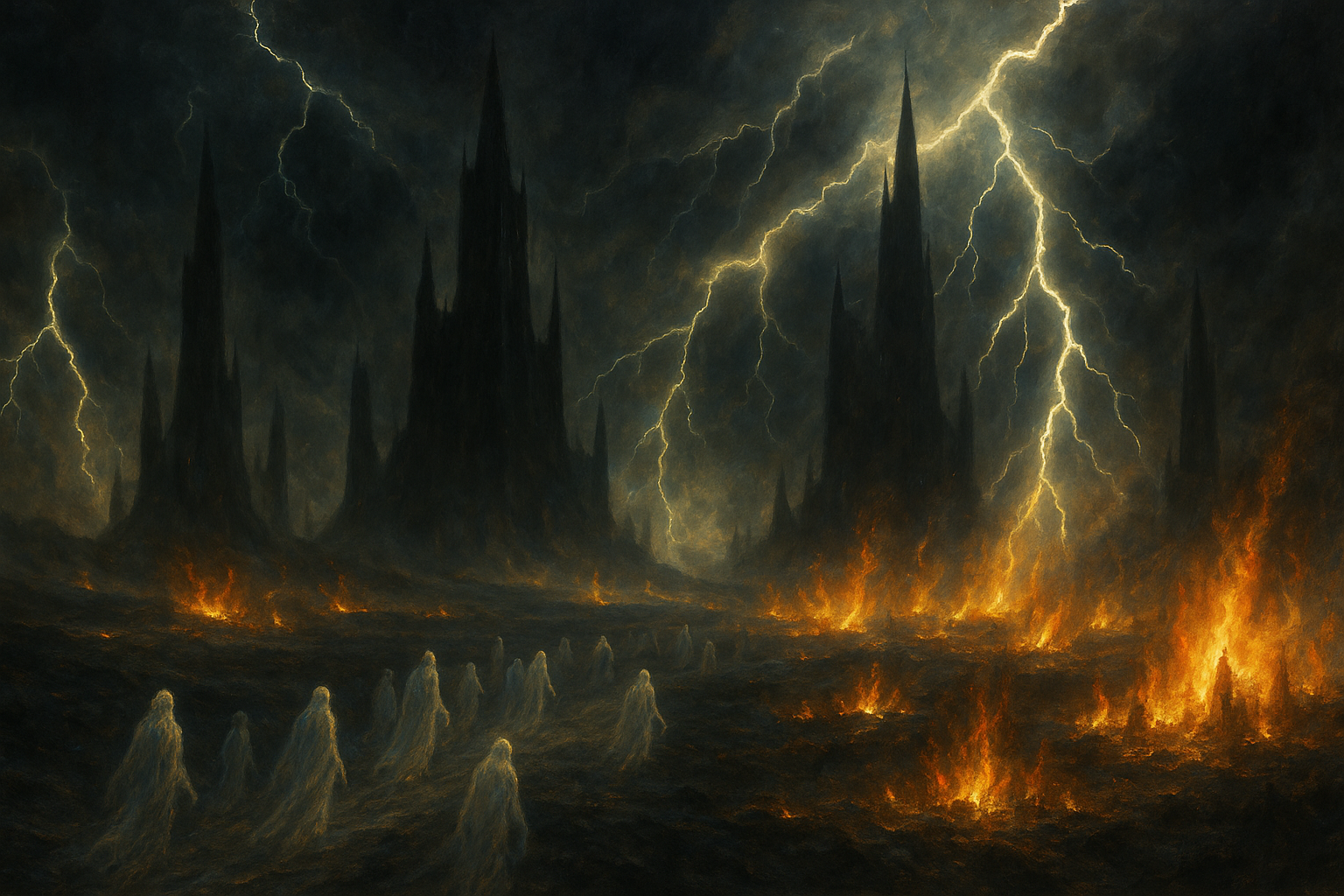 De gigantesques tours noires surgissent du sol comme des obélisques menaçants, frappées par des éclairs destructeurs.