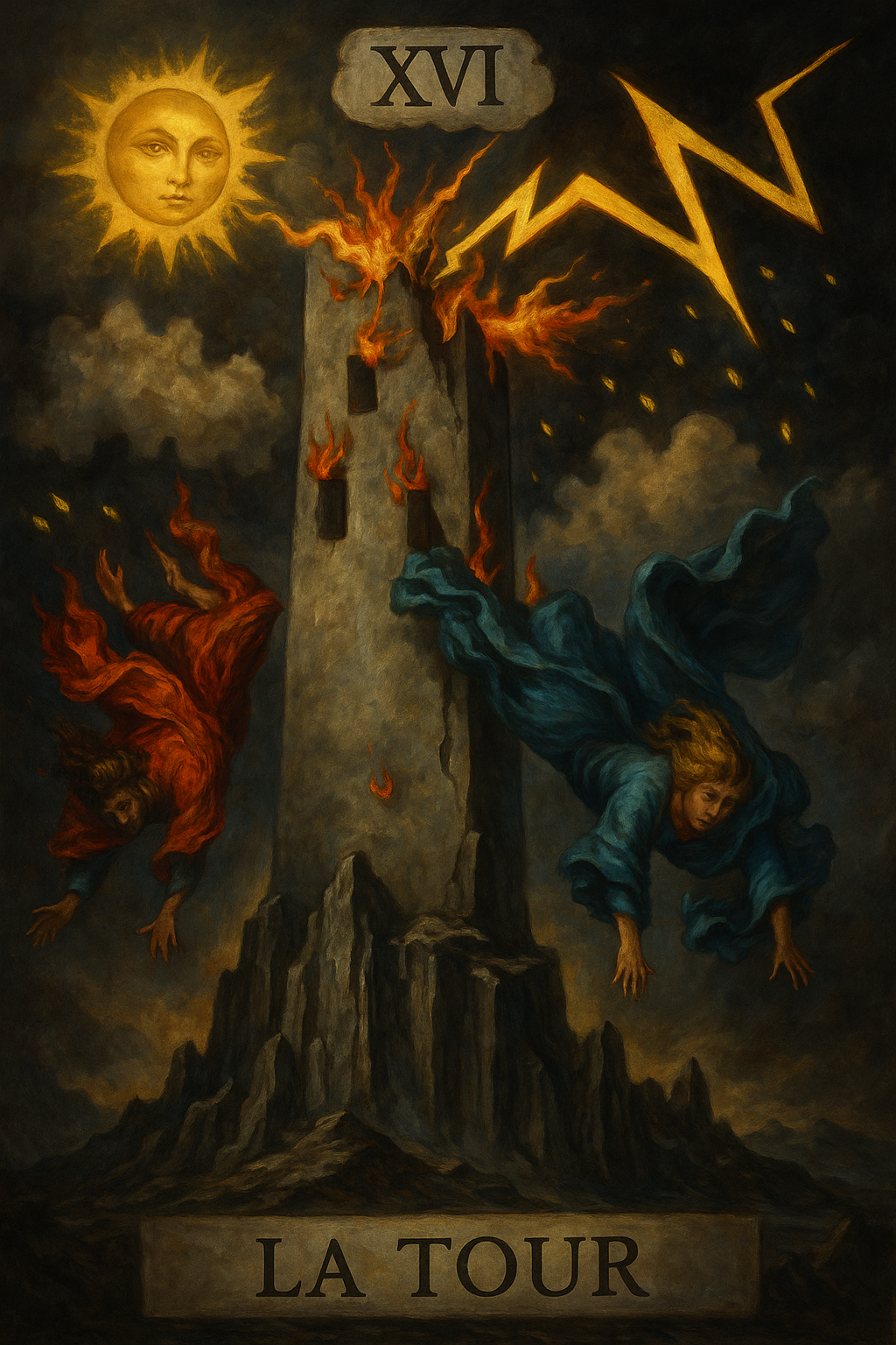 La carte de La Tour (arcane XVI du Tarot) est l’image du bouleversement soudain, de l’effondrement des structures trop rigides ou illusoires. On y voit souvent une tour frappée par la foudre, d’où chutent des personnages : symbole de la destruction nécessaire des orgueils, des faux savoirs et des sécurités illusoires. La Tour n’est pas seulement catastrophe : elle est révélation. Elle rappelle que ce qui est construit sur des bases fausses doit s’écrouler pour laisser place à une reconstruction plus juste.