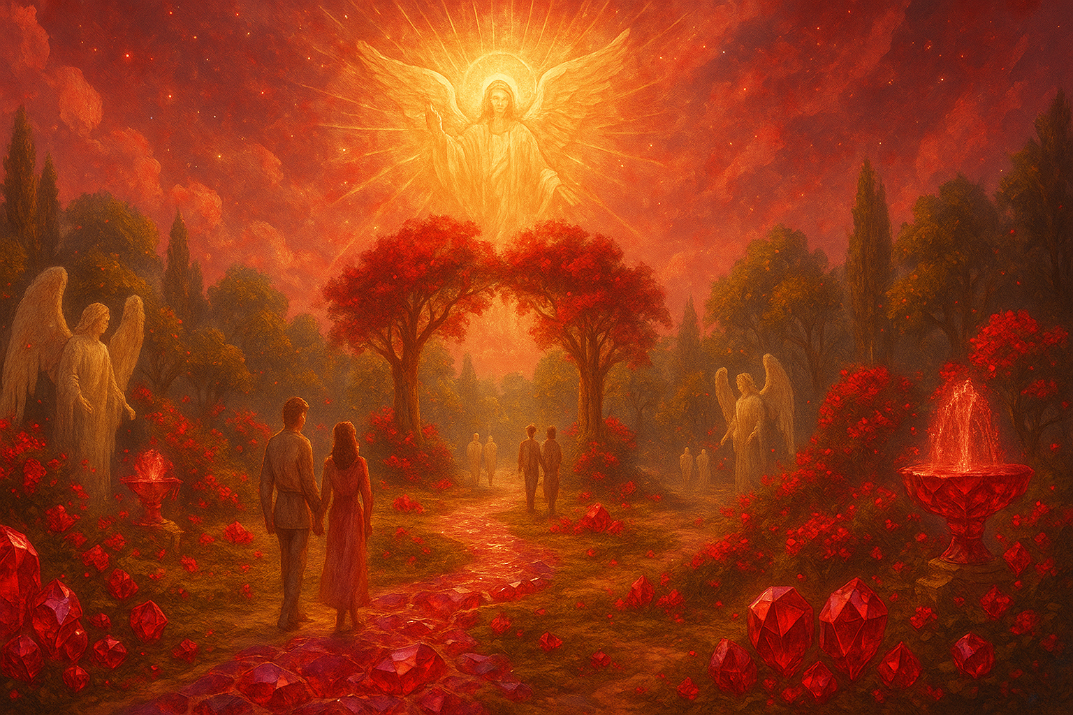 Dans le ciel apparaît l’image d’un archange rayonnant levant la main pour bénir les unions.
