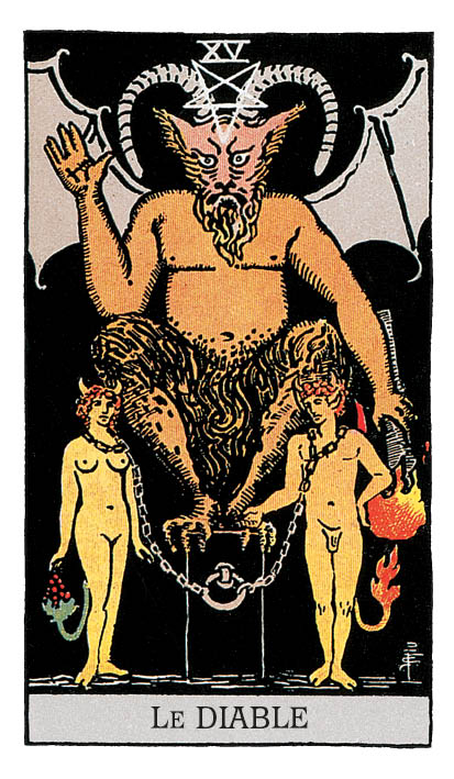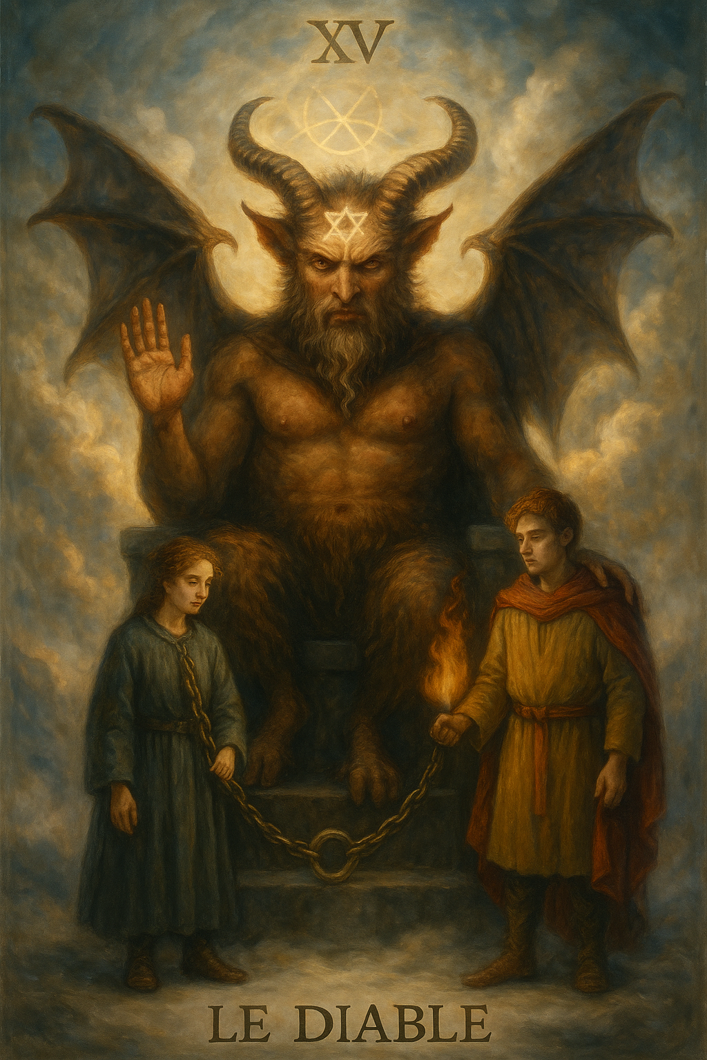 La carte du Diable (arcane XV du Tarot) symbolise la matière, l’instinct, la puissance des désirs et des pulsions qui enchaînent l’âme lorsqu’ils ne sont pas maîtrisés. On y voit souvent une figure cornue, trônant au-dessus de deux personnages enchaînés, mais dont les liens sont assez lâches pour qu’ils puissent s’en libérer. Le Diable incarne la part d’ombre, l’illusion de l’asservissement aux forces de la chair, de l’avidité et du pouvoir. Mais il est aussi, paradoxalement, un maître initiatique : en affrontant ses chaînes, l’âme apprend à se connaître et à se libérer de ses conditionnements.