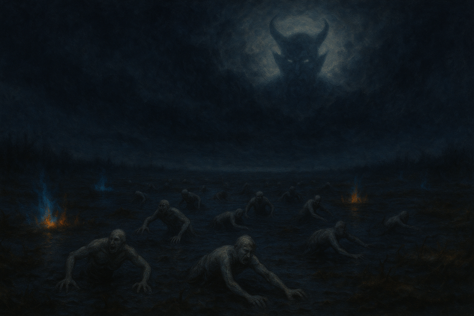 Dans le ciel, apparaît parfois la silhouette diffuse d’un diable gigantesque, aux ailes sombres et aux cornes flamboyantes, dont le regard pétrifie les âmes.