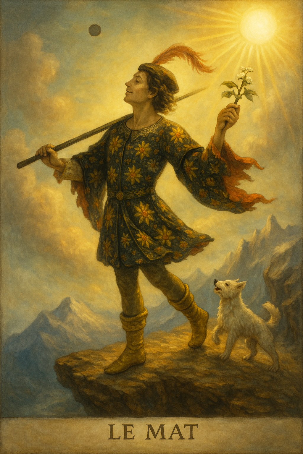 La carte du Fou, ou Le Mat, occupe une place unique dans le Tarot ésotérique. Dépourvue de numéro, ou parfois marquée d’un zéro, elle se tient en marge de l’ordre établi. Elle est à la fois le commencement et l’aboutissement du chemin initiatique : l’âme qui s’élance pour la première fois dans le monde, et l’initié accompli qui, ayant traversé toutes les épreuves, se libère de toute attache.