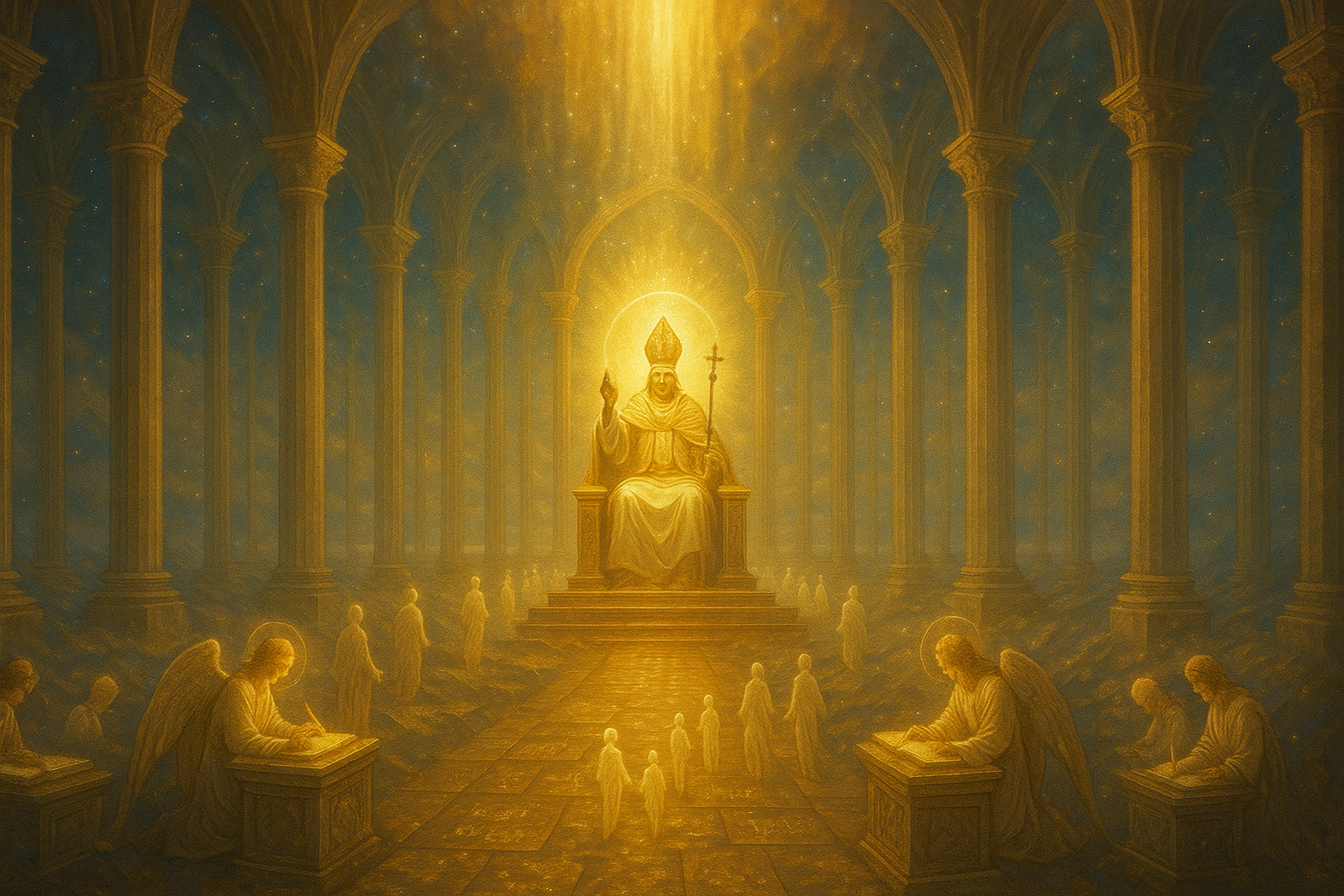 De part et d’autre, des chœurs d’anges scribes consignent les vérités révélées dans des livres de cristal.