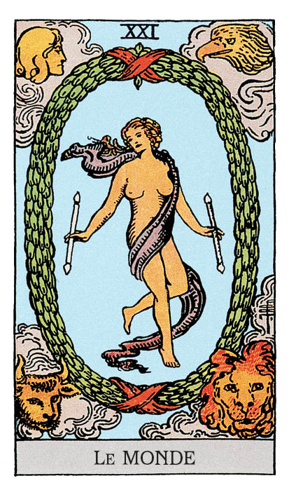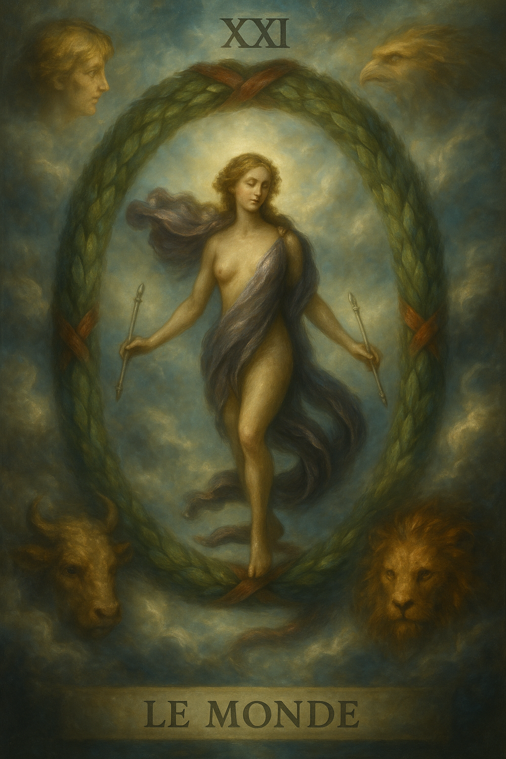 La carte du Monde (arcane XXI, parfois considérée comme XXII lorsqu’on inclut Le Fou) représente l’accomplissement, l’unité et la réalisation ultime du chemin initiatique. On y voit une figure féminine ou androgynique dans une mandorle, entourée des quatre vivants (ange, taureau, lion, aigle), symboles des forces fondamentales de la Création. Le Monde incarne la plénitude : l’âme réconciliée avec elle-même et avec l’univers, ayant intégré toutes les épreuves et découvert sa place dans le Grand Tout. C’est l’arcane de l’achèvement, de la célébration et du retour à l’harmonie originelle.
