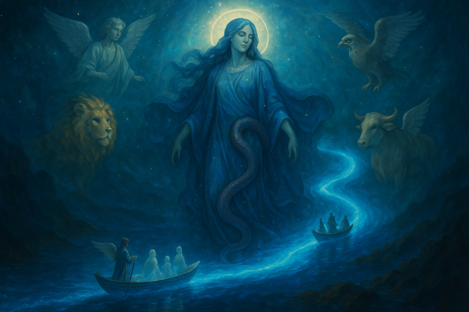 Dans l’immensité du cosmos, on distingue Univers, une figure féminine drapée et enroulée d’un serpent. Elle incarne la totalité et l’achèvement, l’union des forces contraires dans une même danse éternelle.
