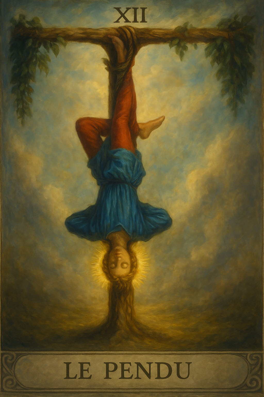 La carte du Pendu (arcane XII du Tarot) est l’une des plus énigmatiques. Elle représente le sacrifice, l’inversion du regard et la suspension volontaire. On y voit un homme pendu par un pied, mais au visage calme, comme s’il avait choisi cette posture. Le Pendu enseigne la détente dans l’épreuve, l’acceptation de l’impuissance apparente, afin d’accéder à une compréhension supérieure. Ce n’est pas une punition, mais une initiation : se dépouiller de l’ego, lâcher prise pour renaître à une nouvelle vision.