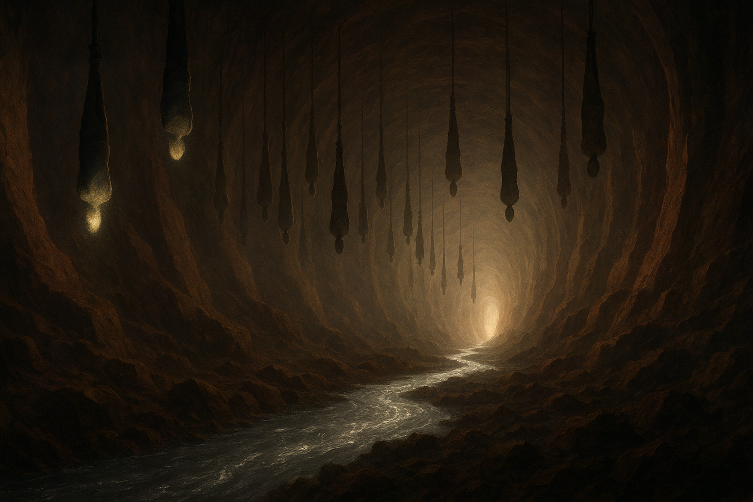 De la voûte de pierre, des milliers d’âmes sont suspendues par les pieds, oscillant dans le silence, comme figées dans une éternelle attente. Certaines brillent doucement, d’autres sont ternes et presque consumées.