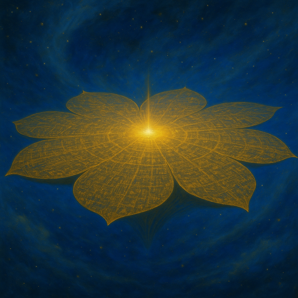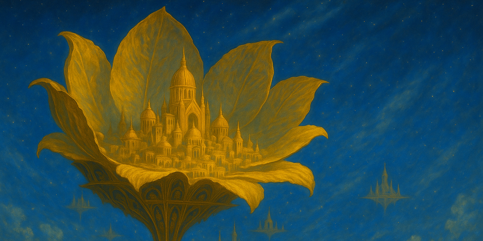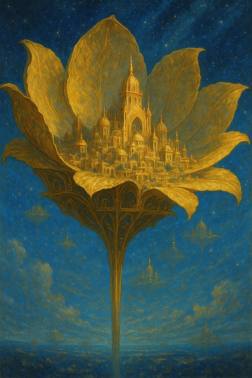 Les mondes-fleurs en sont l’exemple le plus éclatant. Chacun se déploie comme une corolle gigantesque flottant dans le ciel doré, ses pétales formés d’îles, de cités ou de jardins suspendus. Les pétales abritent des quartiers entiers, reliés par des ponts translucides qui s’incurvent selon des arcs de lumière. Les cités de Tiphéreth se construisent donc non pas sur un sol fixe, mais dans une géométrie mouvante, où les perspectives varient au gré des cycles. L’urbanisme de ces mondes repose sur des motifs fractals : d’immenses rosaces cosmiques, des labyrinthes spiralés, des avenues rayonnant d’un centre lumineux vers les confins des pétales.