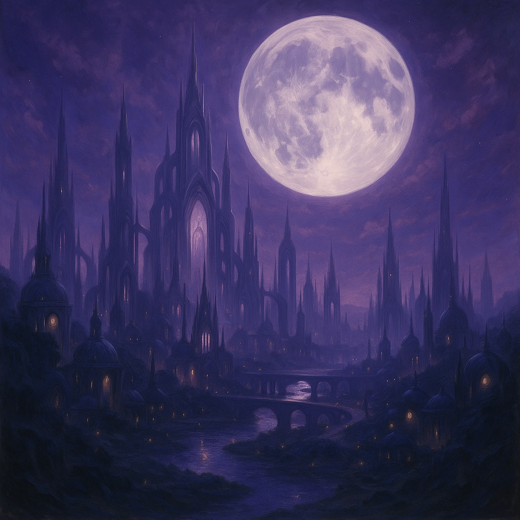 L’architecture de Yesod reflète la nature mouvante et onirique de ce royaume. Les cités, suspendues dans le ciel violet autour de Levannah, ne suivent pas de plan fixe : elles se déploient comme des spirales galactiques, leurs avenues de lumière s’entrecroisant comme les bras d’une constellation. Les bâtiments semblent faits de matière translucide, cristal, verre liquide, pierre luminescente, qui capte la clarté lunaire et se teinte différemment selon les phases de Levannah. Ainsi, une même cité ne présente jamais le même visage d’un cycle lunaire à l’autre.