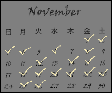 - Did not write even once over the long Veteran's Day weekend. (If memory serves, I was binge watching Attack on Titan...)