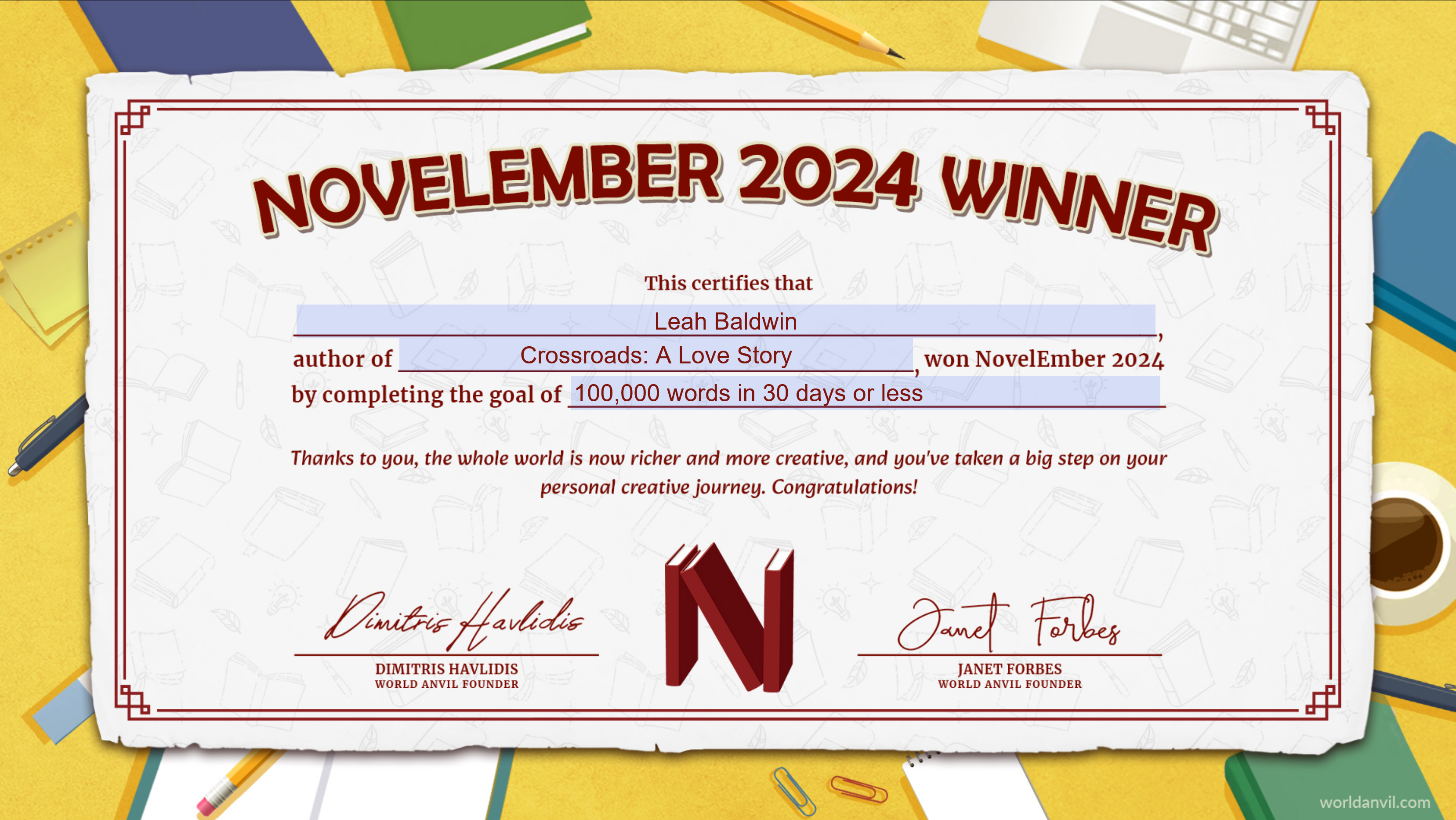 Welcome to my NovelEmber 2024 page! There isn't much in the way of blogging down below because I only kept a physical journal tracking my word count for this challenge, so the page here was added in retrospect with the little notes I did have and what I can remember. That said, you will find some pertinent details to the right. ^^
