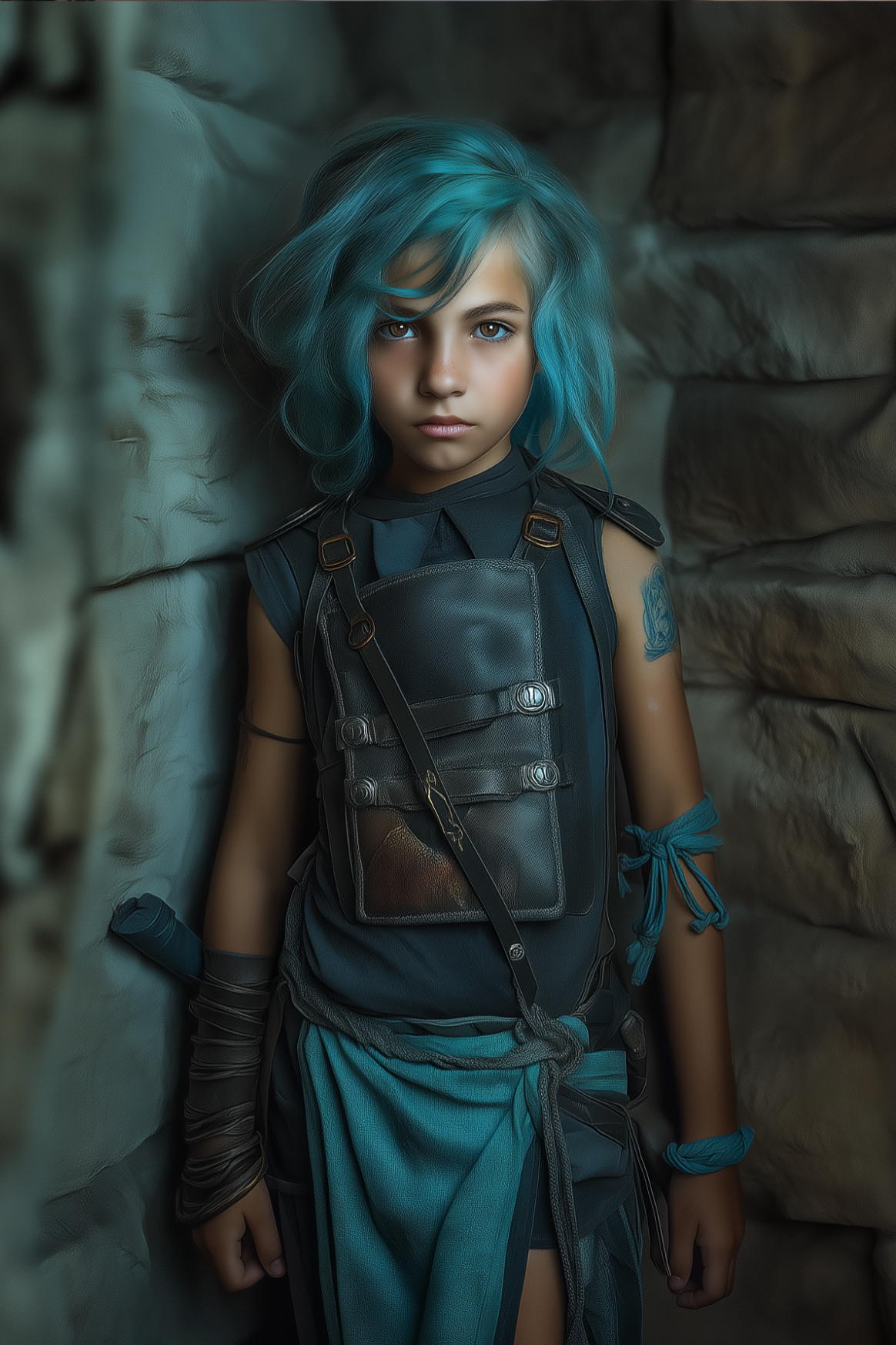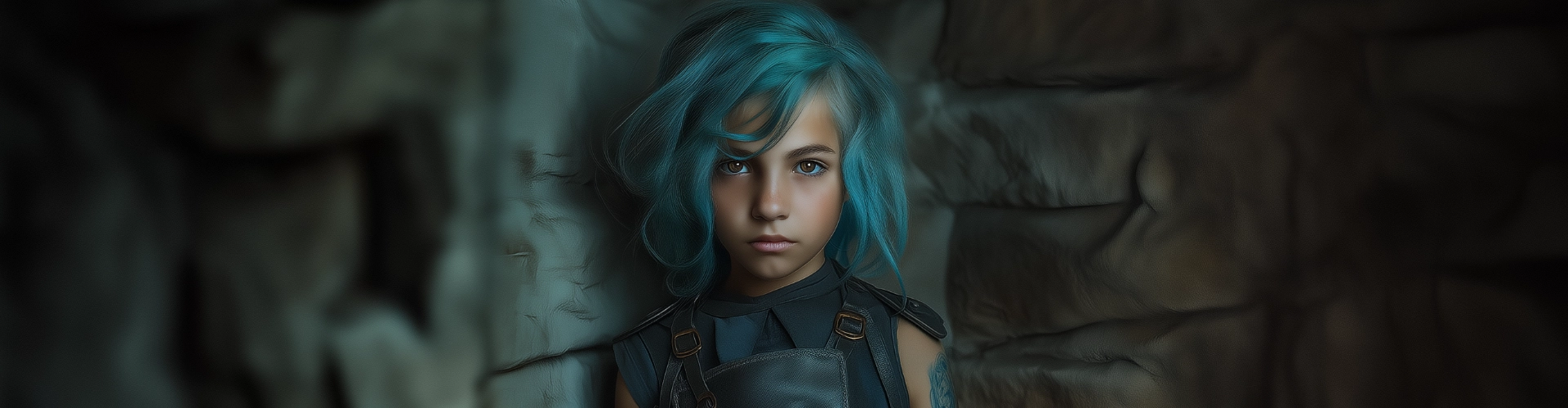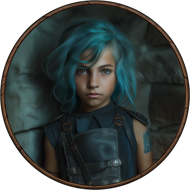 Cheveux lâchés, avec une frange qui cache partiellement son visage. Yeux Grands et expressifs, trahissant une mélange d’innocence et de détermination. Mince et petite, elle a une allure agile et rapide, reflétant sa survie dans les rues.