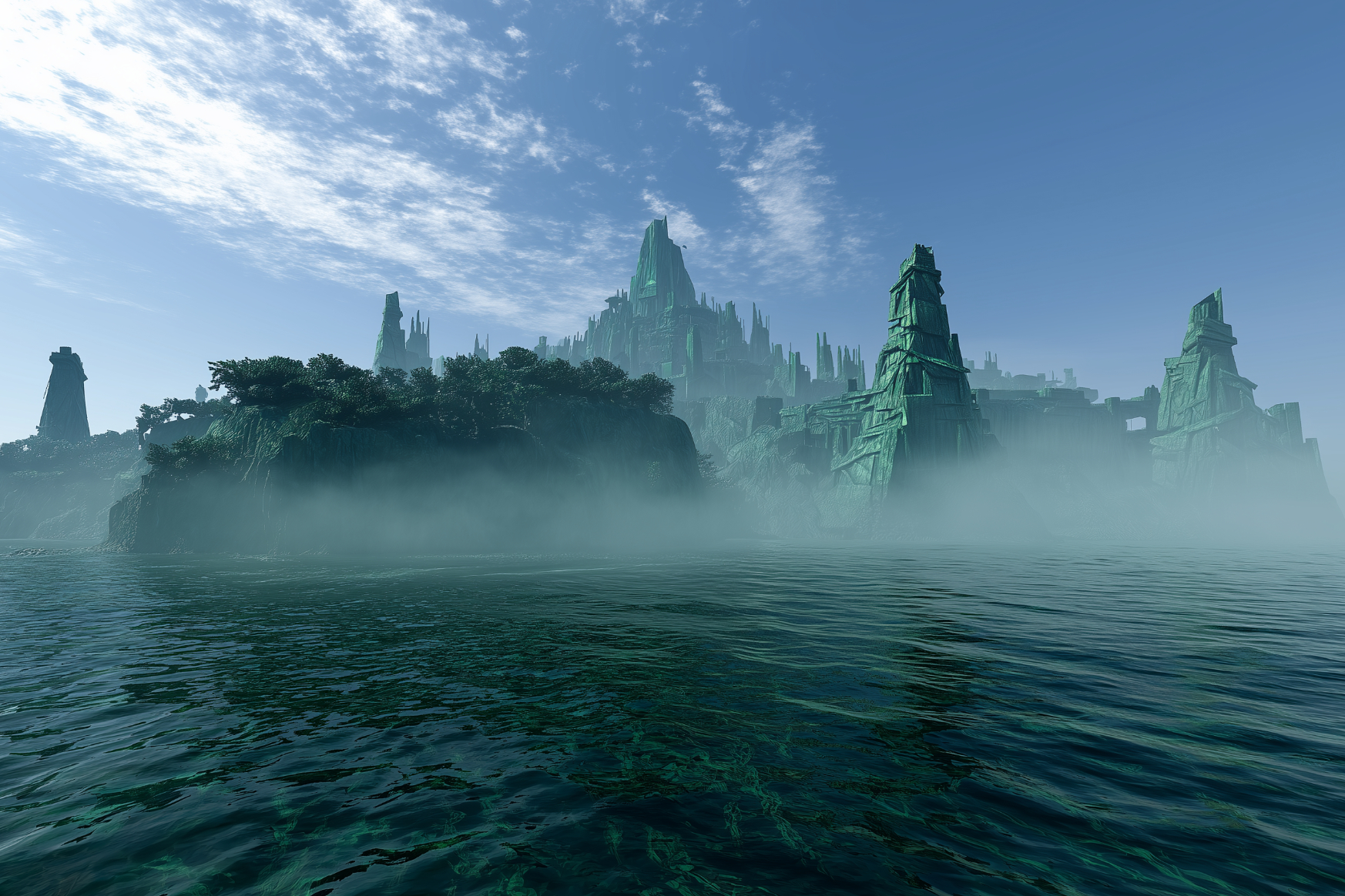 Les bâtiments qui se dressent sur l'île n’ont aucun sens, leurs formes tordues et leurs angles impossibles défiant toute logique architecturale. Les tours semblent pencher de manière inquiétante, comme sur le point de s'effondrer, et les murs sont couverts de hiéroglyphes anciens et incompréhensibles. Kit baisse la longue-vue et se tourne vers son équipage, son visage marqué par une détermination nouvelle :