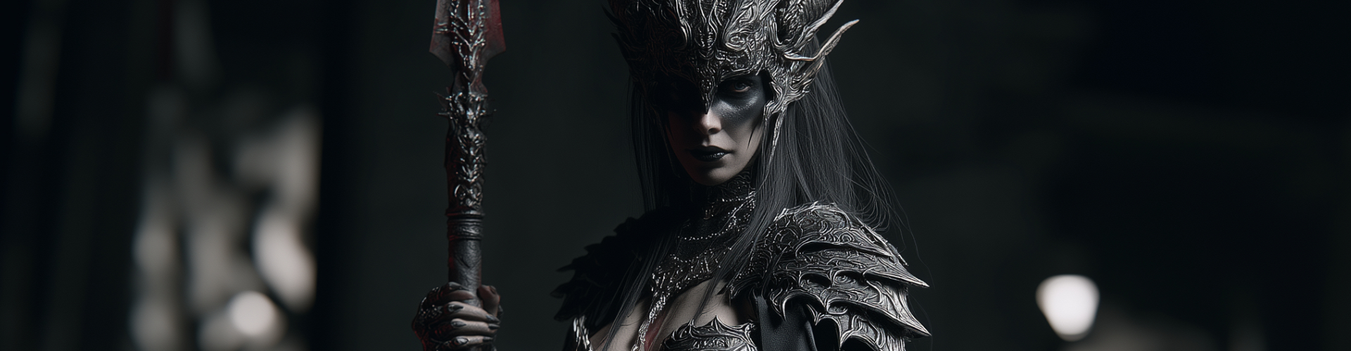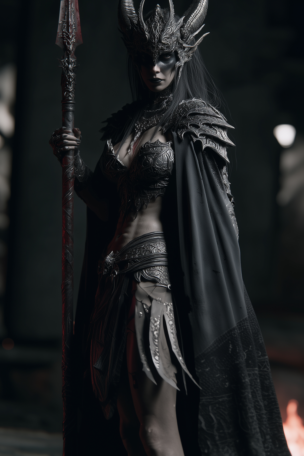 En tant que femme, Guerrière des Ténèbres, elle porte un costume élaboré et sombre qui dégage une aura de mystère et de puissance. Son costume comprend une armure complexe avec des motifs ornés et des éléments métalliques, couvrant la majeure partie de son torse et de ses bras. Elle porte également un masque ou un casque qui cache ses traits faciaux, mais laisse visibles ses yeux et sa bouche. Ses cheveux sont longs, noirs et lisses, cascadant sur ses épaules et dans son dos.