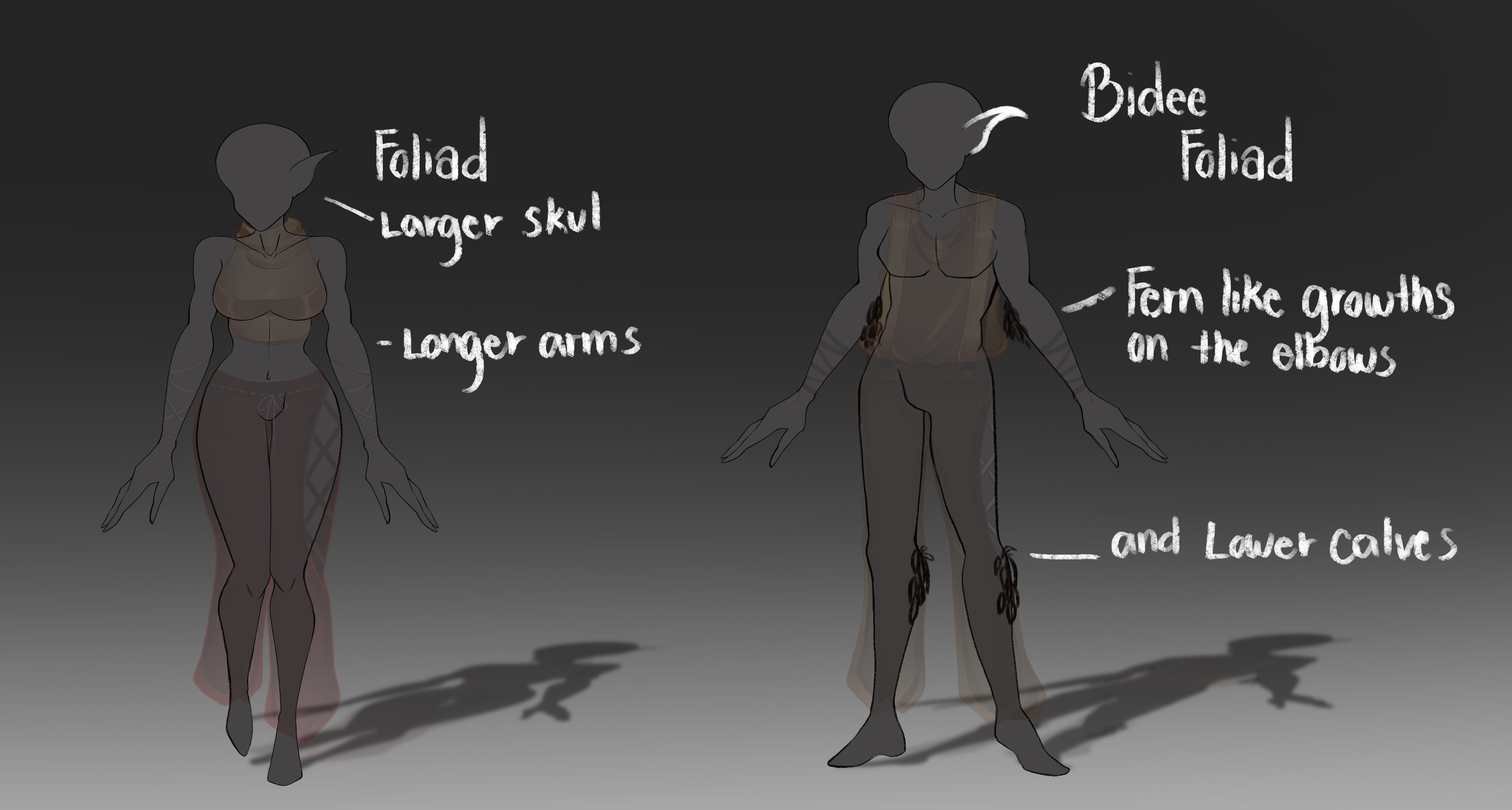 Bidee Foliad have lack the larger eyes, having longer but slightly curved ears, and fern like growths on the elbows and lower calves, and their naturally thicker soles. Their skulls have thick groves shaping back from behind their ears. Their ears are also slightly thinner.