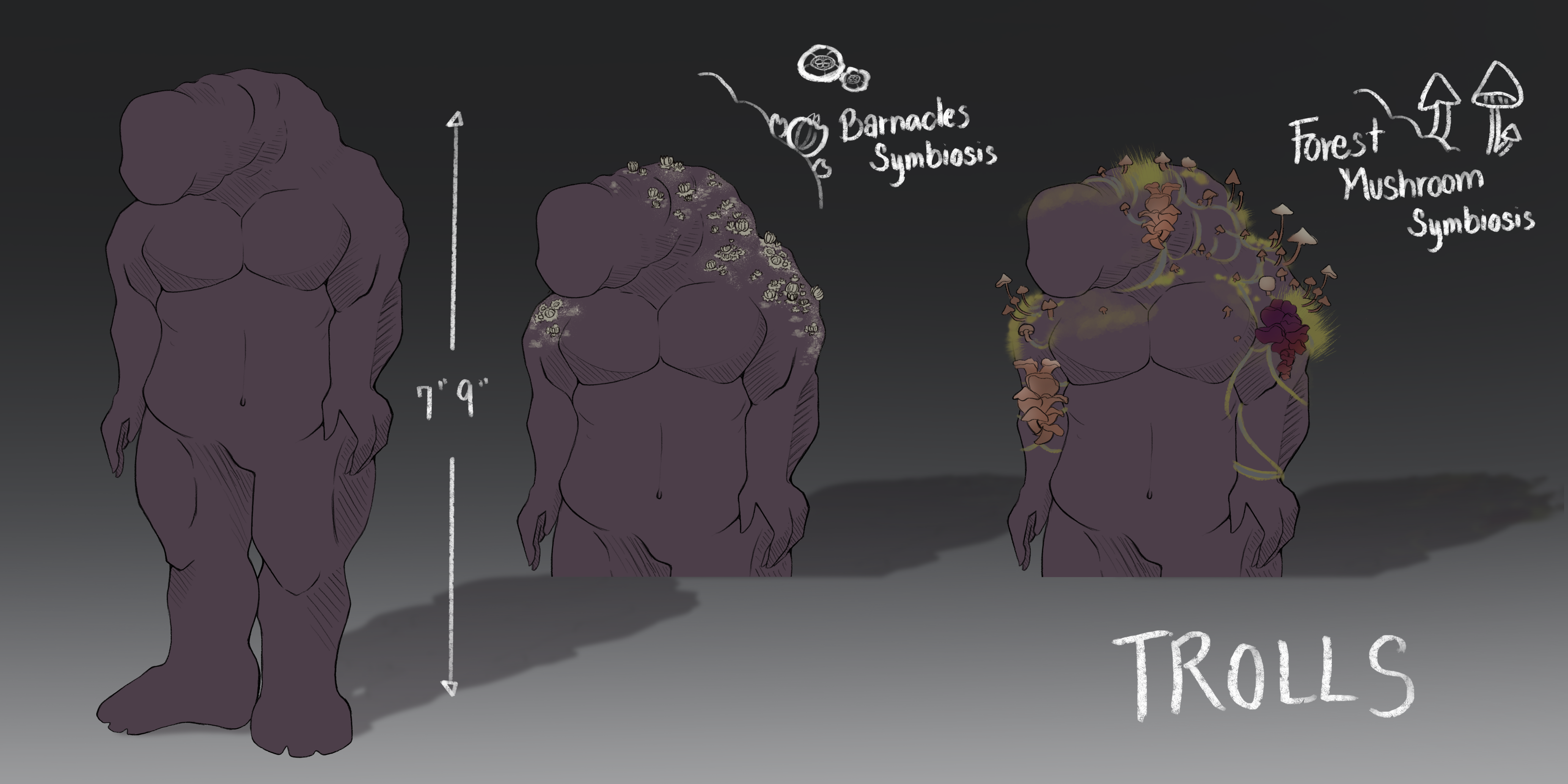 Humanoid silhouette. Ranging between 7 and 9 feet tall. Rough skin, solid brow line, usually stooped posture and thick musculature. Stocky. Tend to easily form symbiosis with sea barnacles or forest mushrooms.