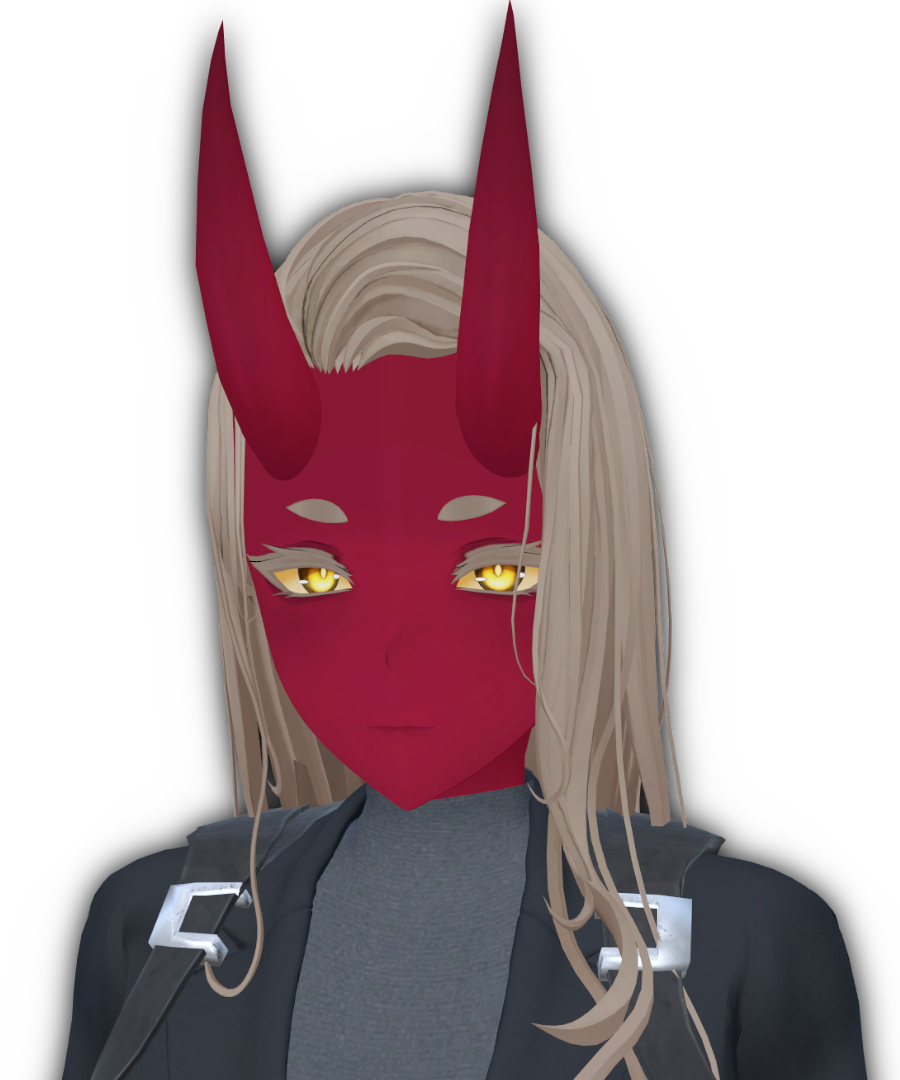 She’s lean and deliberate, the kind of figure that moves with purpose rather than flourish. Her skin is a deep crimson, smooth and unbroken, the sharp rise of two horns crowning her forehead with a natural edge of menace. Long, pale hair slips around her face and down her shoulders, strands falling loose despite the way it’s been brushed back, a reminder that she doesn’t waste time on perfection. The outfit she wears is practical, a dark set of gear strapped with heavy buckles that glint against the fabric every piece chosen for function first, appearance second. The cut is clean, but nothing about it suggests comfort, it’s built for work, for survival.